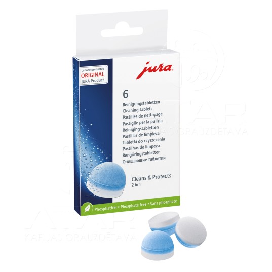 JURA kafijas automāta tīrīšanai un aizsardzībai, izmantojiet tikai oriģinālās JURA tīrīšanas tabletes. Tikai šīs tabletes ir precīzi piemērotas automātiskā tīrīšanas cikla veikšanai.